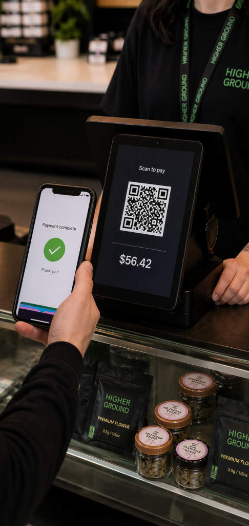 The funds move directly from the customer’s bank account. The dispensary’s system reflects the completed payment. The customer walks out or their order is confirmed without any cash changing hands.